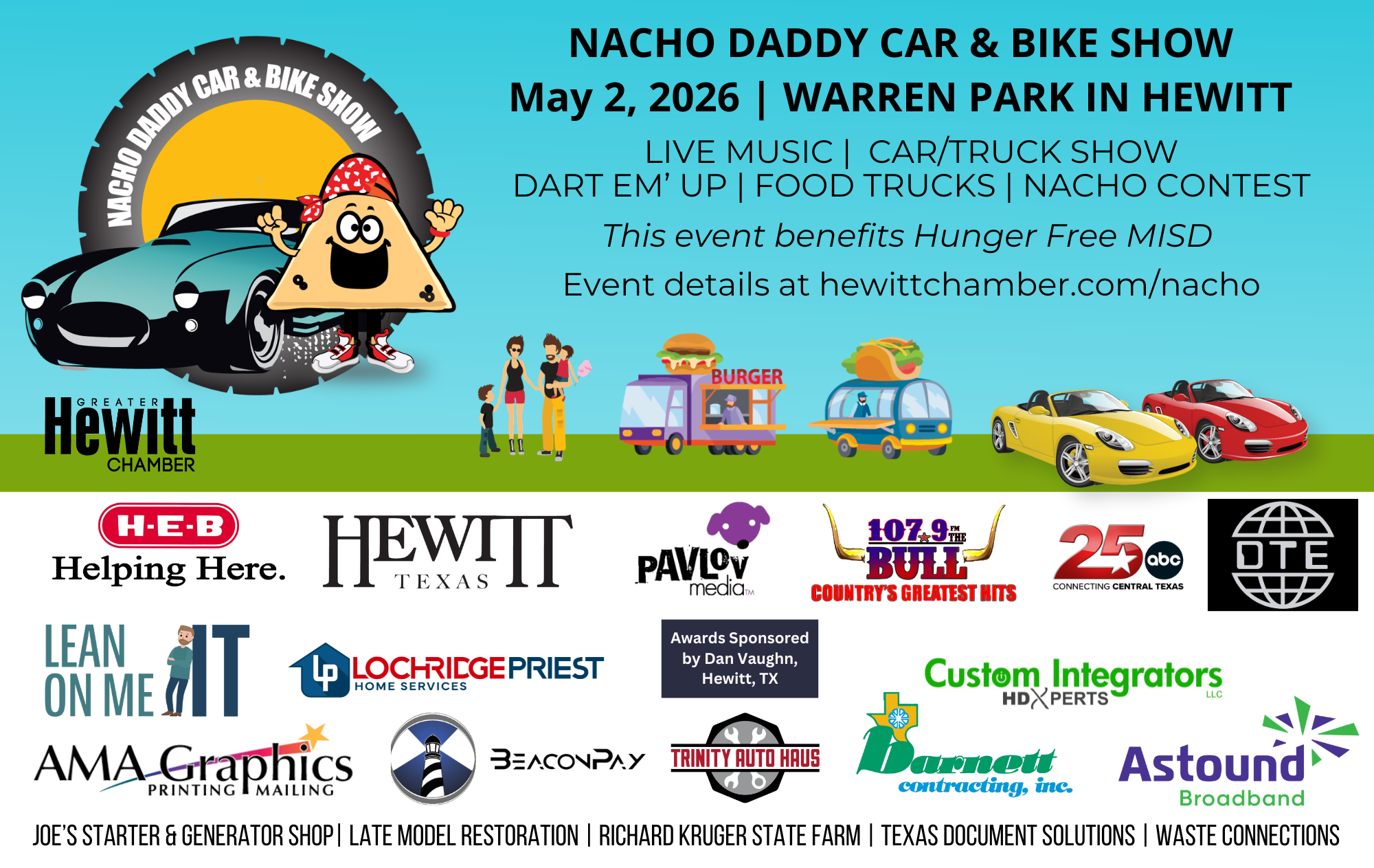 The Greater Hewitt Chamber’s Nacho Daddy Car Show & Concert will take place May 2, 2026 at Warren Park in Hewitt, TX!