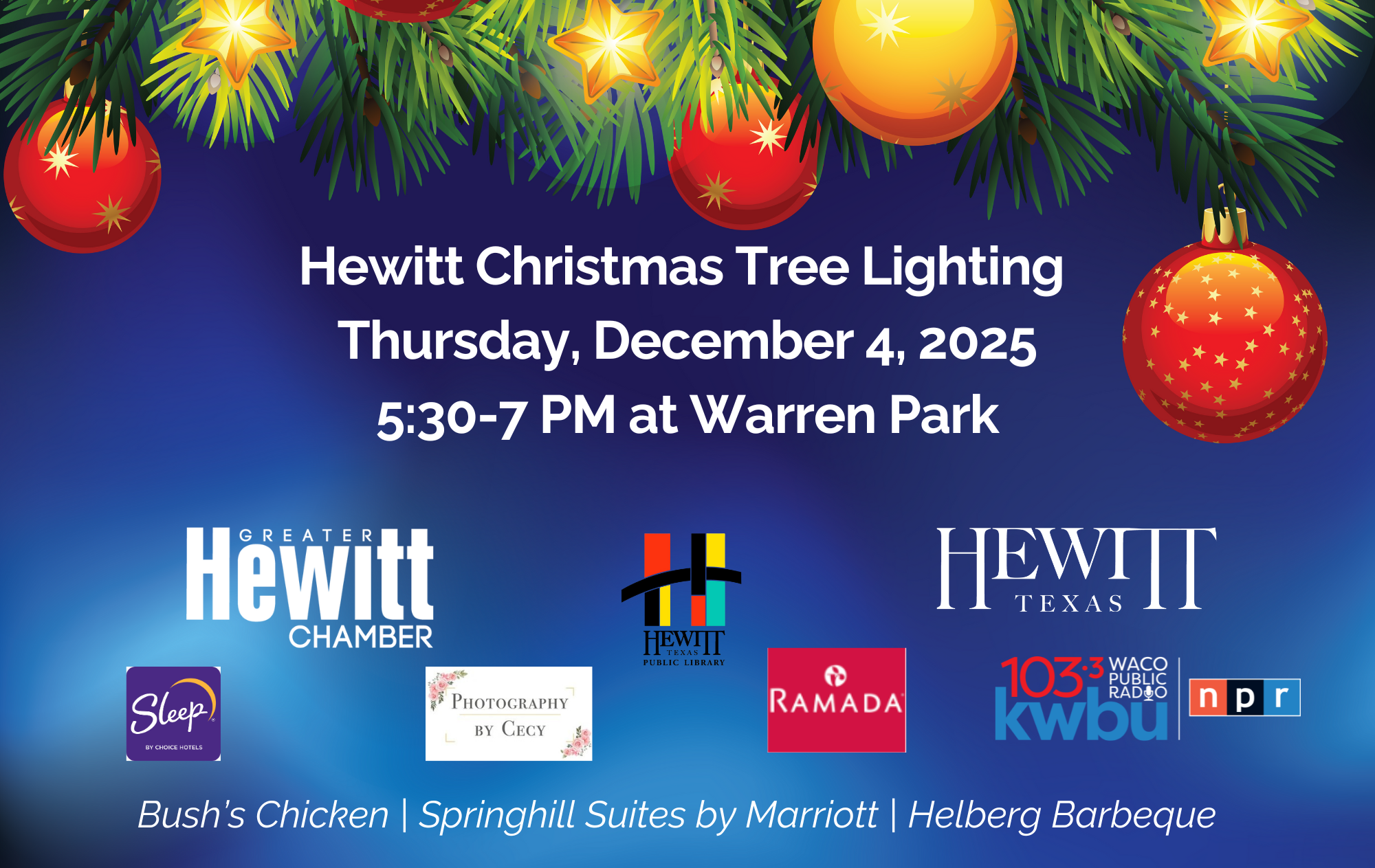 - Event banner displayed at Tree Lighting, recognition on Chamber e-bulletin, HewittChamber.com and CityofHewitt.com, Social Media Networks and Event Flyer