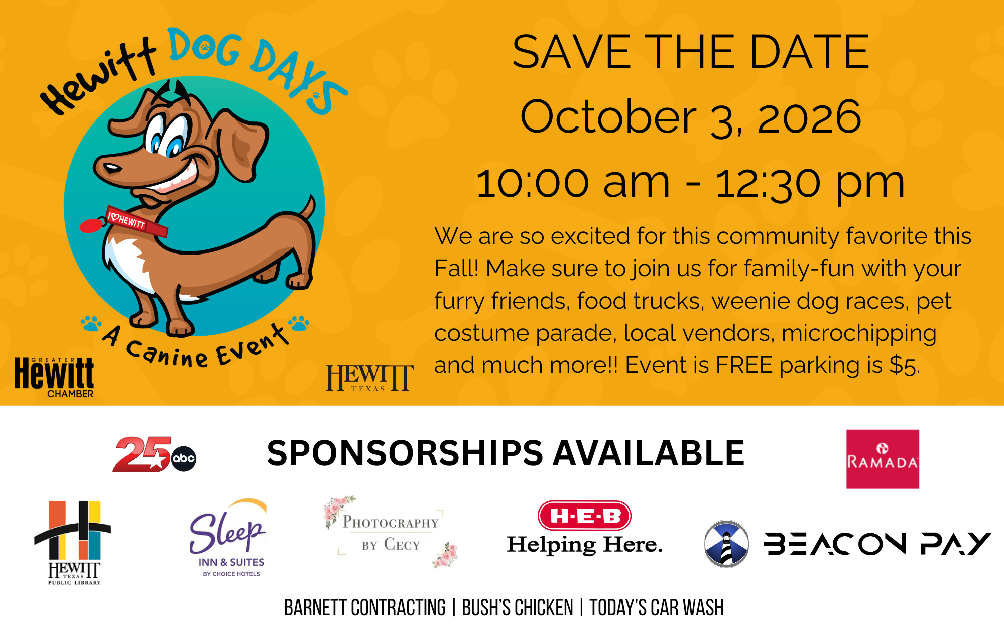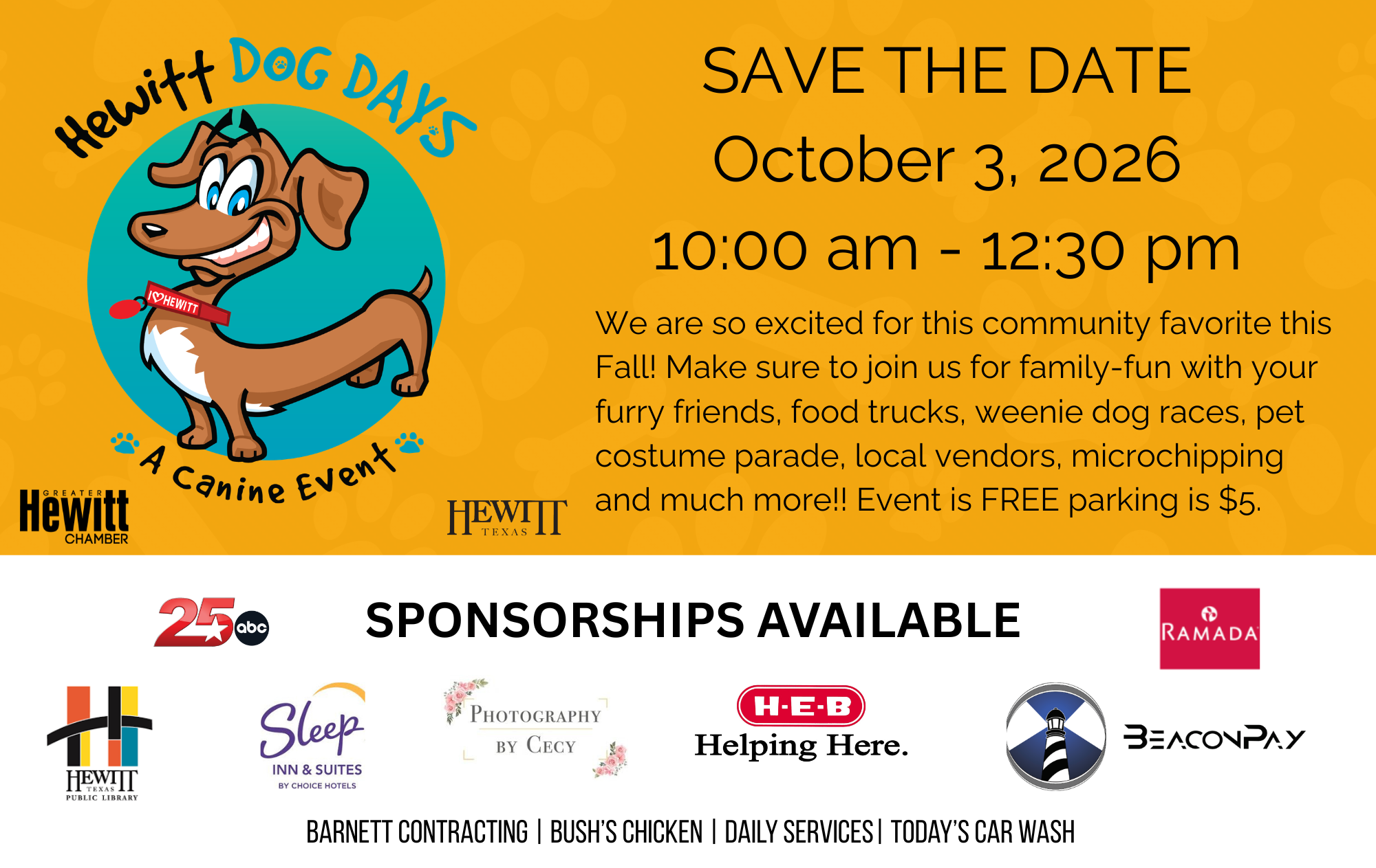 Logo on leashes given to first 150 attendees, logo rec on all promotional art promoted through City of Hewitt, Hewitt Public Library & Greater Hewitt Chamber websites & social media | Logo rec on event banner | Logo rec in Thank You blast sent by Greater Hewitt Chamber | Complimentary vendor space | 4 Parking Vouchers
