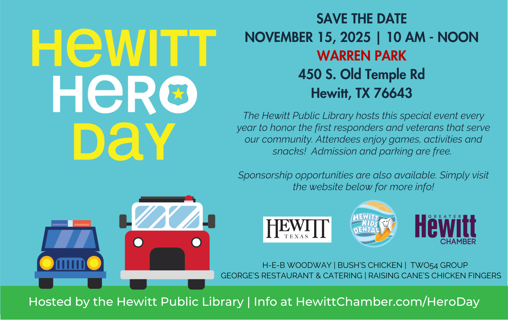 Hero Day will be advertised on HewittChamber.com, Hewitt Express Magazine, Waco & the Heart of Texas, Shooter FM, Facebook and Instagram. Please note that sponsorships are available to Greater Hewitt Chamber members only. To become a member, please visit www.hewittchamber.com/join.