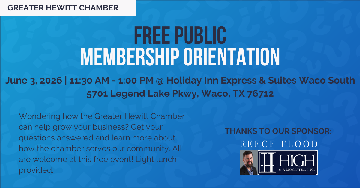 All members and businesses interested in joining the chamber are invited to attend our quarterly Membership Orientations to hear from our chamber leadership and learn more about how to get the most out of your membership. A light lunch is provided, and there is no cost to attend this event. Learn more about maximizing your membership at HewittChamber.com/90days.