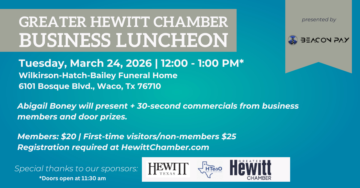 Lunch & Learn Programs (sponsorship opportunities for business or organization members listed below) take place monthly on rotating days of the week from 12:00 p.m. to 1:00 p.m. providing opportunities for all members to participate. Dates, lunch fare and venues are set at the beginning of each quarter by the chamber staff and will be posted to the chamber calendar and on the Greater Hewitt Chamber Facebook Page. The program begins with announcements, sponsor recognition and an educational program, followed by business members receiving 30-second commercials to showcase their business services. First-time visitors are introduced at the close of the program. Average attendance is 40 people.