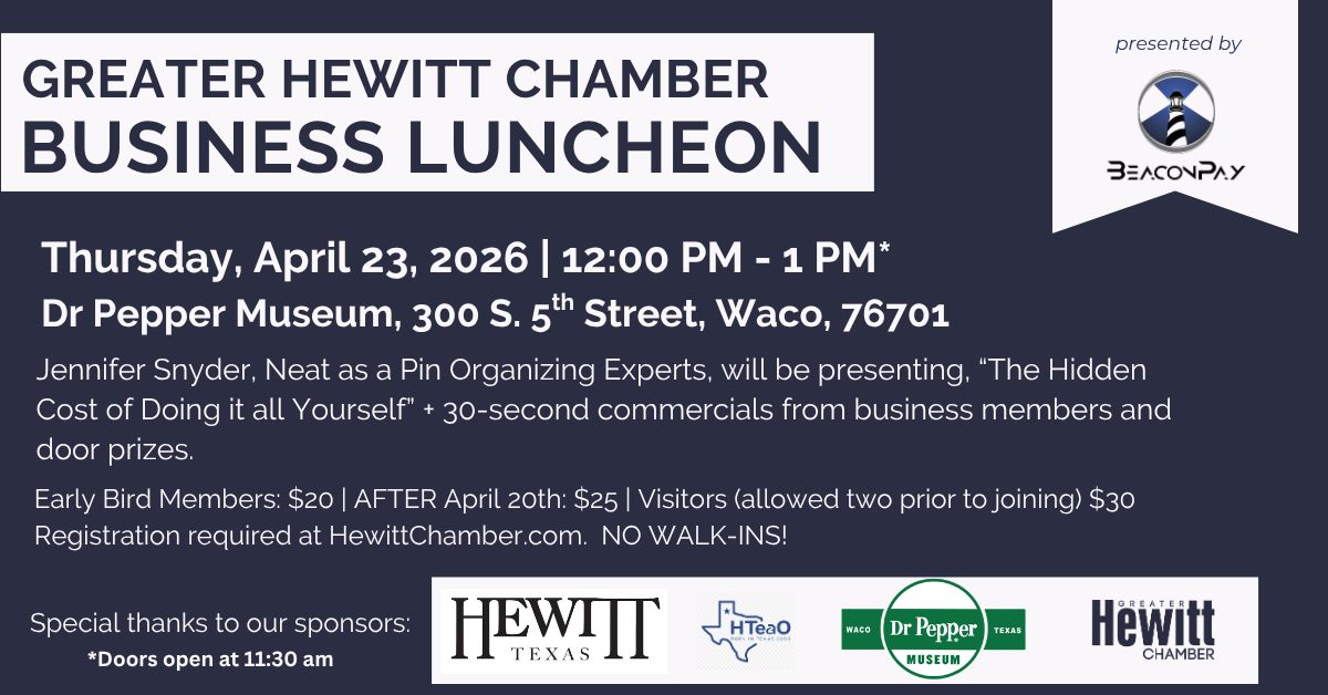 Dates and venues are set at the beginning of each quarter by the chamber staff and will be posted to the events calendar and on the Greater Hewitt Chamber Facebook Page. The program begins with announcements, sponsor recognition and an educational program, followed by business members receiving 30-second commercials to showcase their business services. First-time visitors are introduced at the close of the program. Average attendance is 40-50.