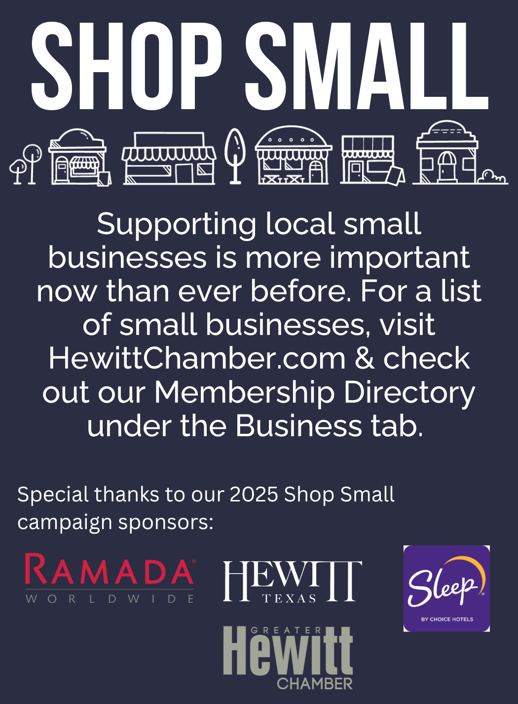 Special thanks for our 2025 Shop Small campaign sponsors: City of Hewitt, Sleep Inn and Ramada