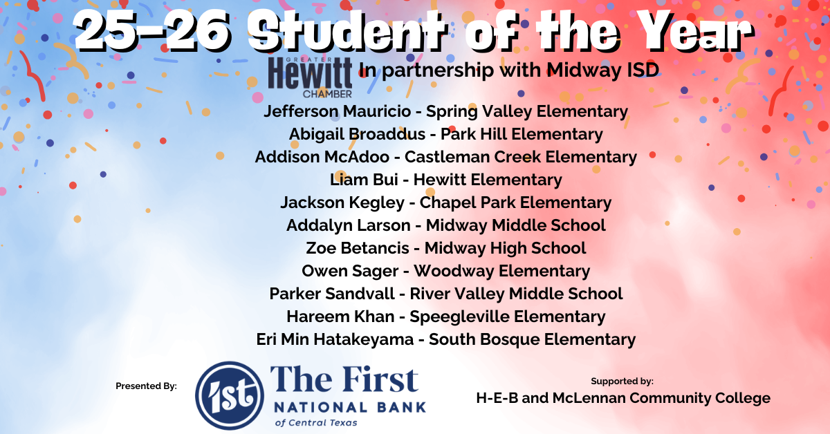 Since 2016, the Greater Hewitt Chamber has partnered with Midway ISD to choose one student at each campus to be recognized as the Student of the Year. The campus faculty has selected past winners for their kindness, leadership, compassion, academic achievements, community involvement and extracurricular activities.